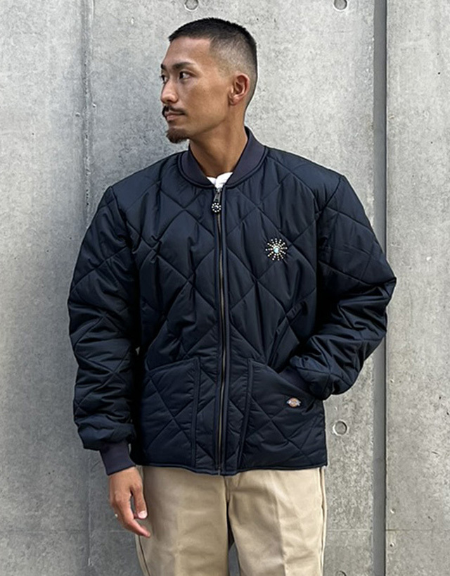 US企画のDickiesダイヤモンドキルトジャケットに、スターバーストモチーフのスタッズワークを施しています。