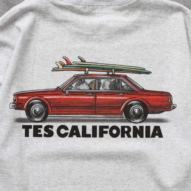 サーフィンへと向かう4匹のフレブル、バックプリントは車に乗り込んだ姿をプリント。