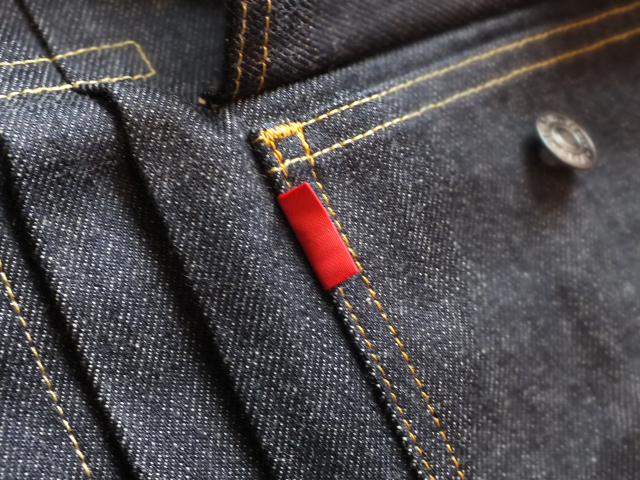 旧式力織機で織られたデニムは両端が赤い糸で縫製してあるのが特徴で、生産効率を考え生地の端まで無駄なく使用して製作されるので、前立て裏などにセルビッジ(赤耳)が見えるディテールが生まれます。