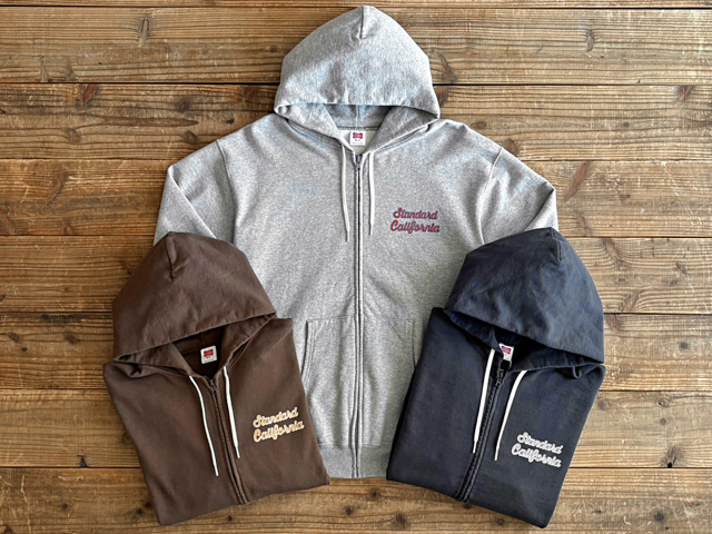 ツートンカラーが新鮮なSDスクリプトロゴをプリントしたUSコットンジップフードスウェット。